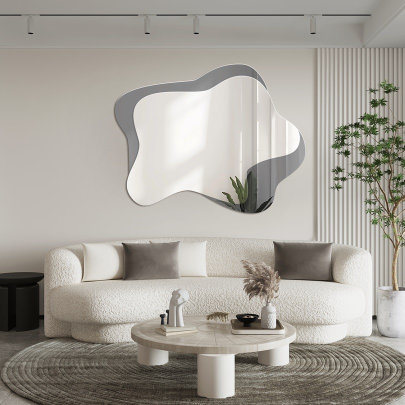 Az organikus formájú tükör jól utal a természetre, valamint a természetes anyagokra és földszínekre. A dekoratív üvegfelület kiemeli a visszafogott esztétikát.
